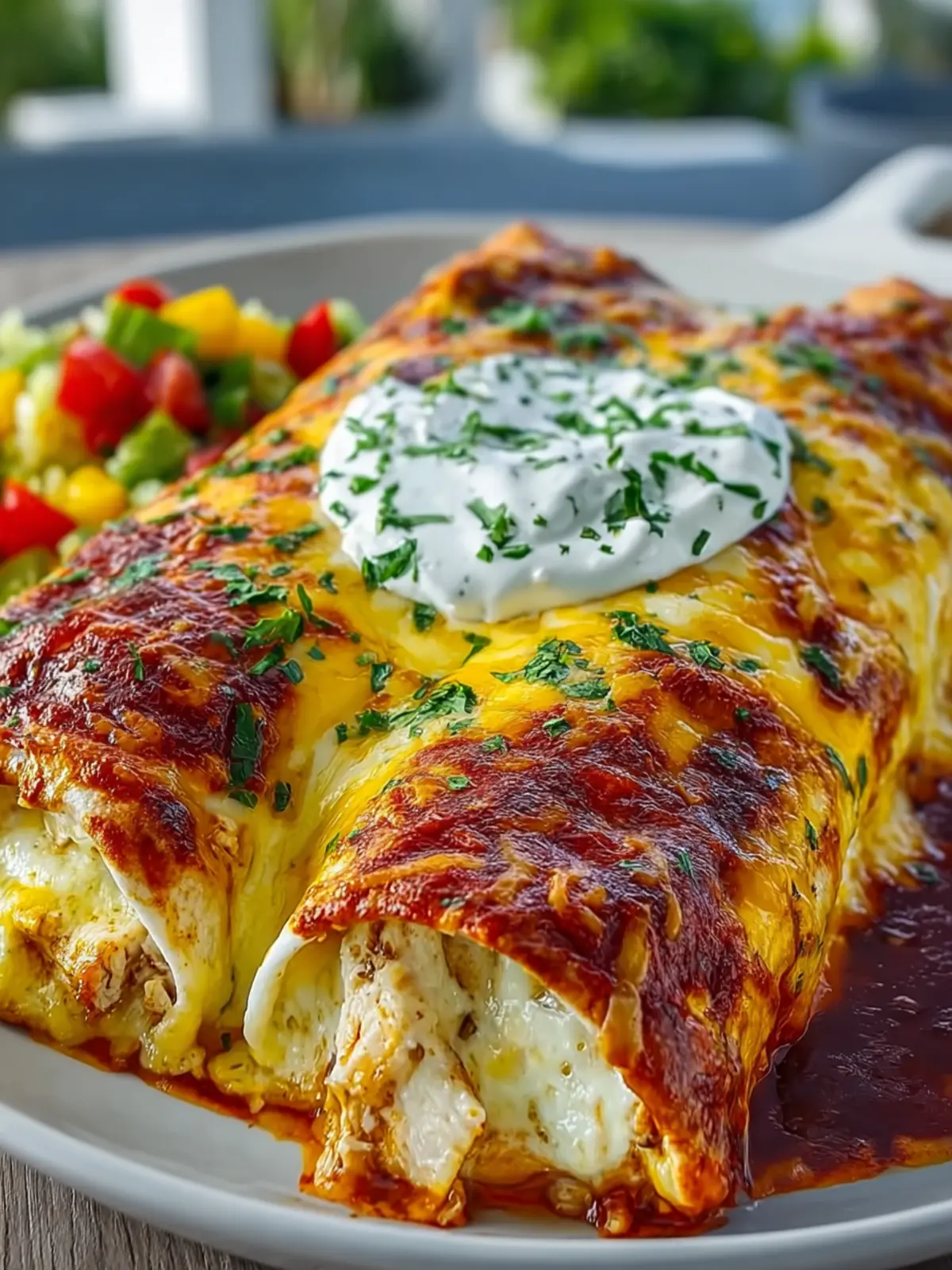 Delicious chicken enchiladas topped with melted cheese and enchilada sauce, perfect for any dinner.
