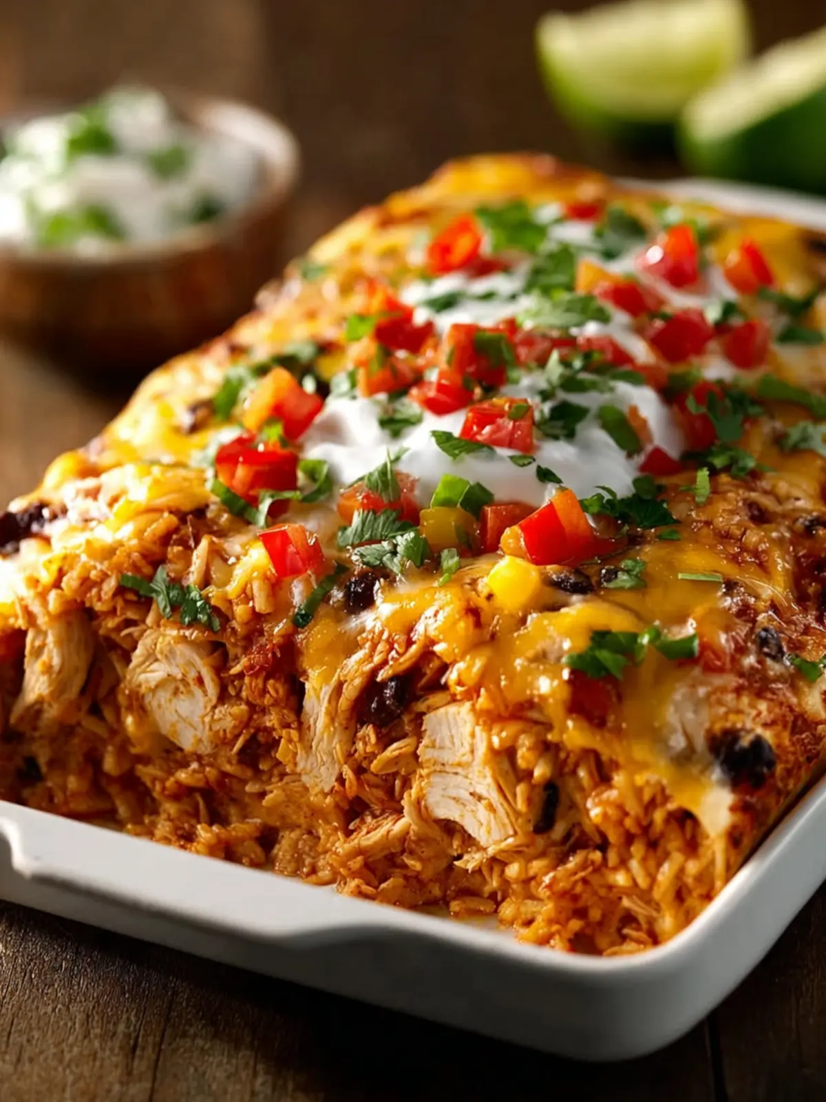 A comforting casserole layered with shredded chicken, rice, beans, and cheese.