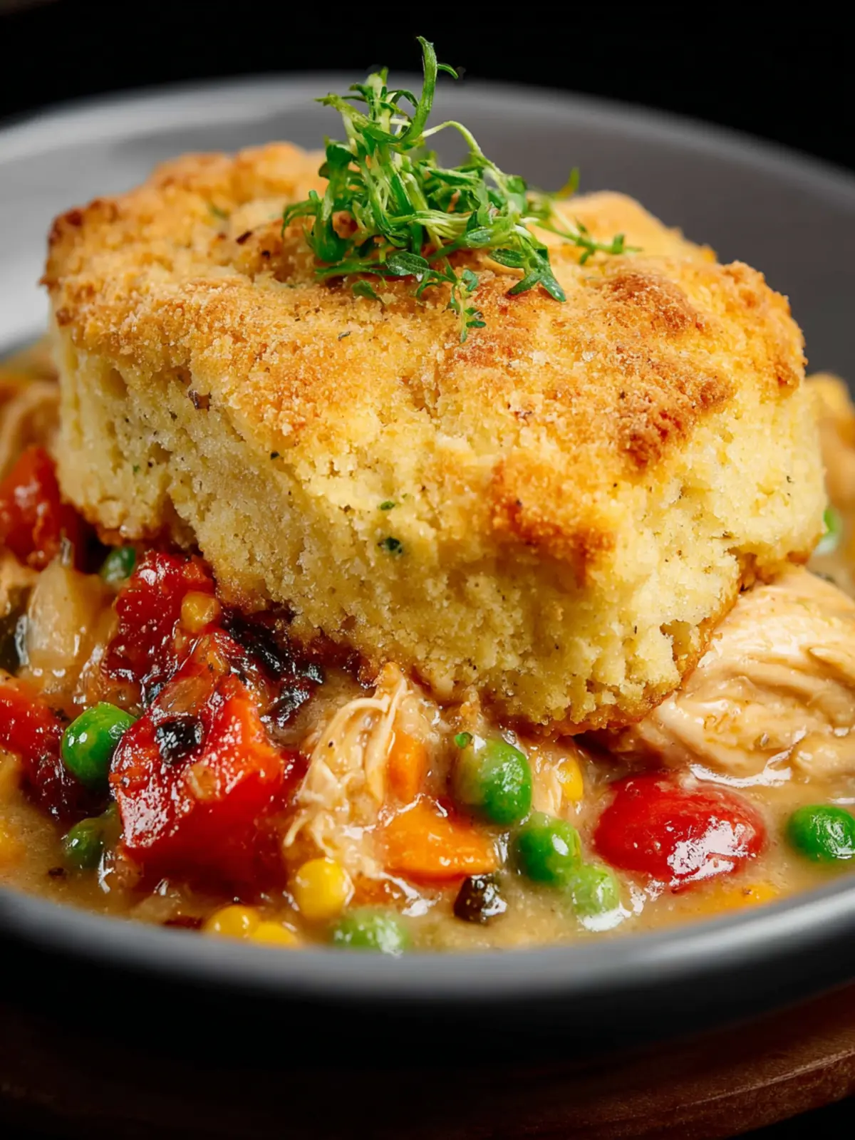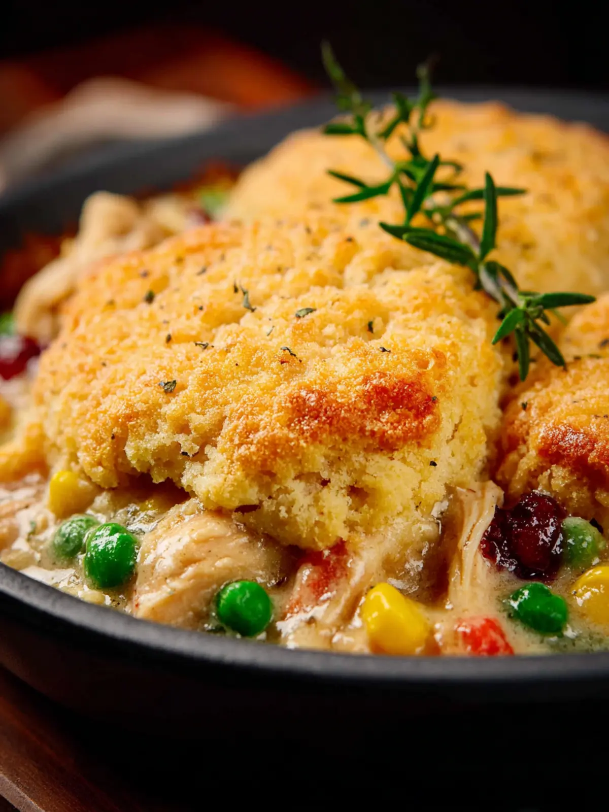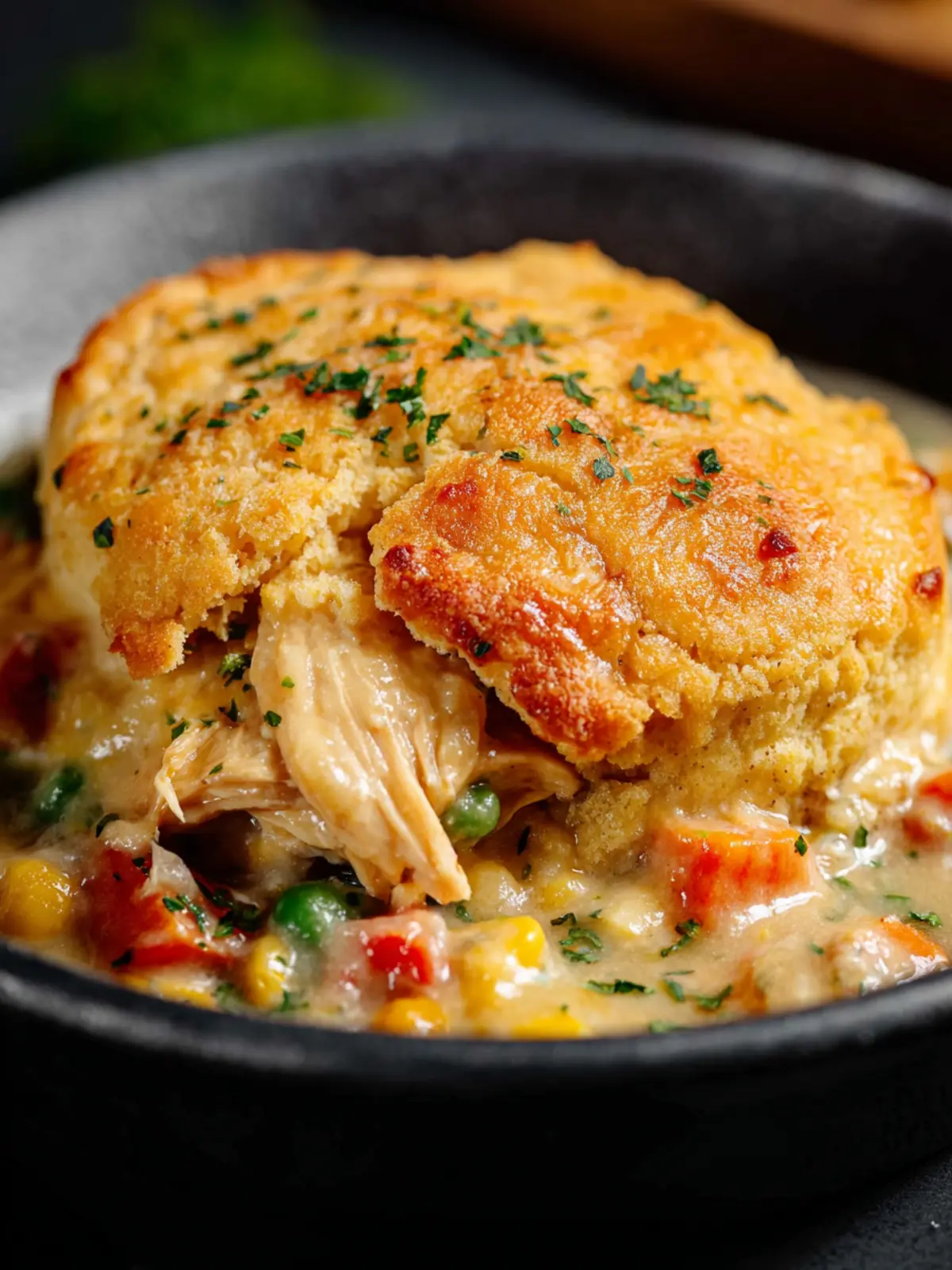 A comforting casserole featuring chicken, vegetables, and a cheesy biscuit topping.