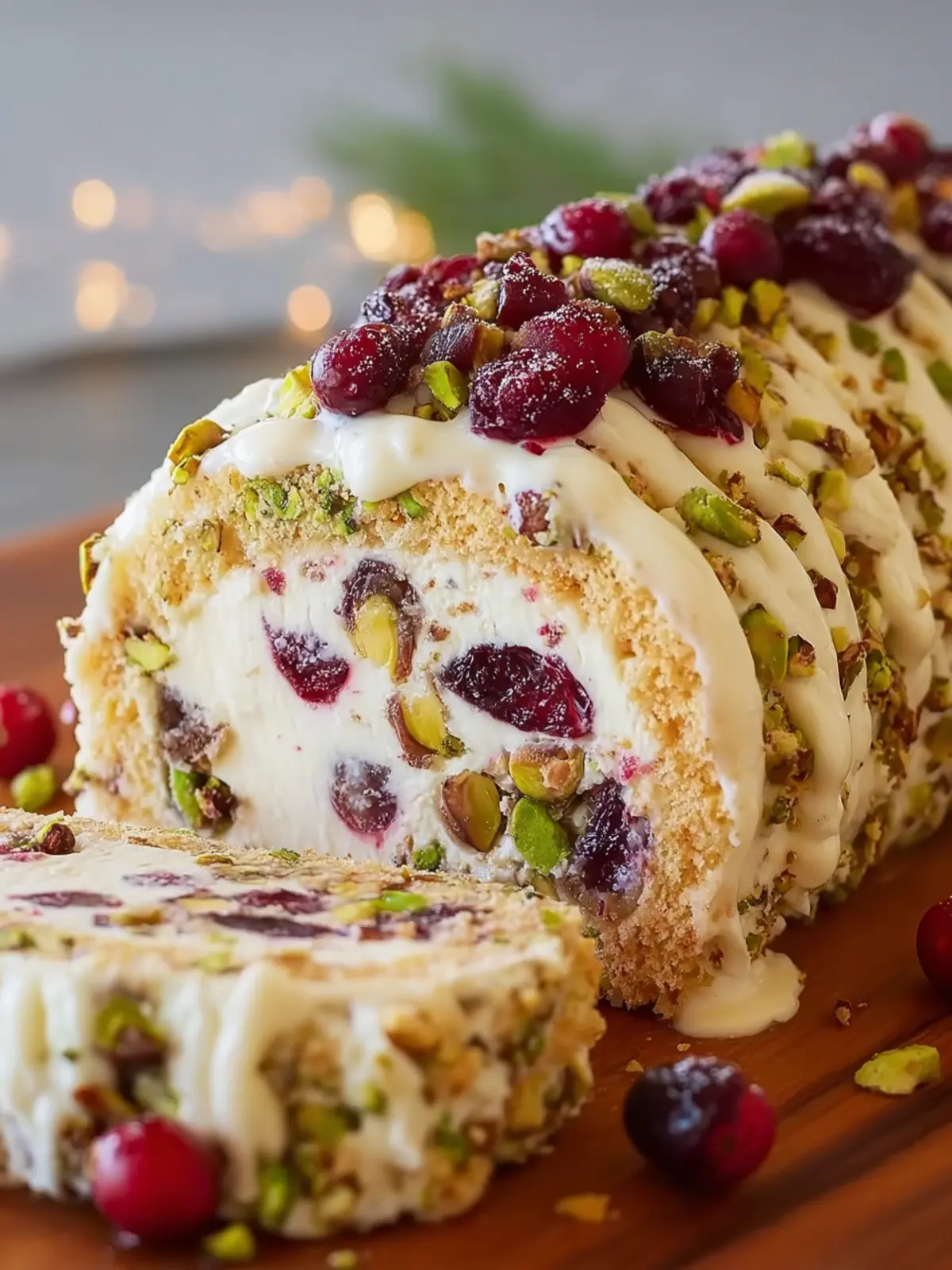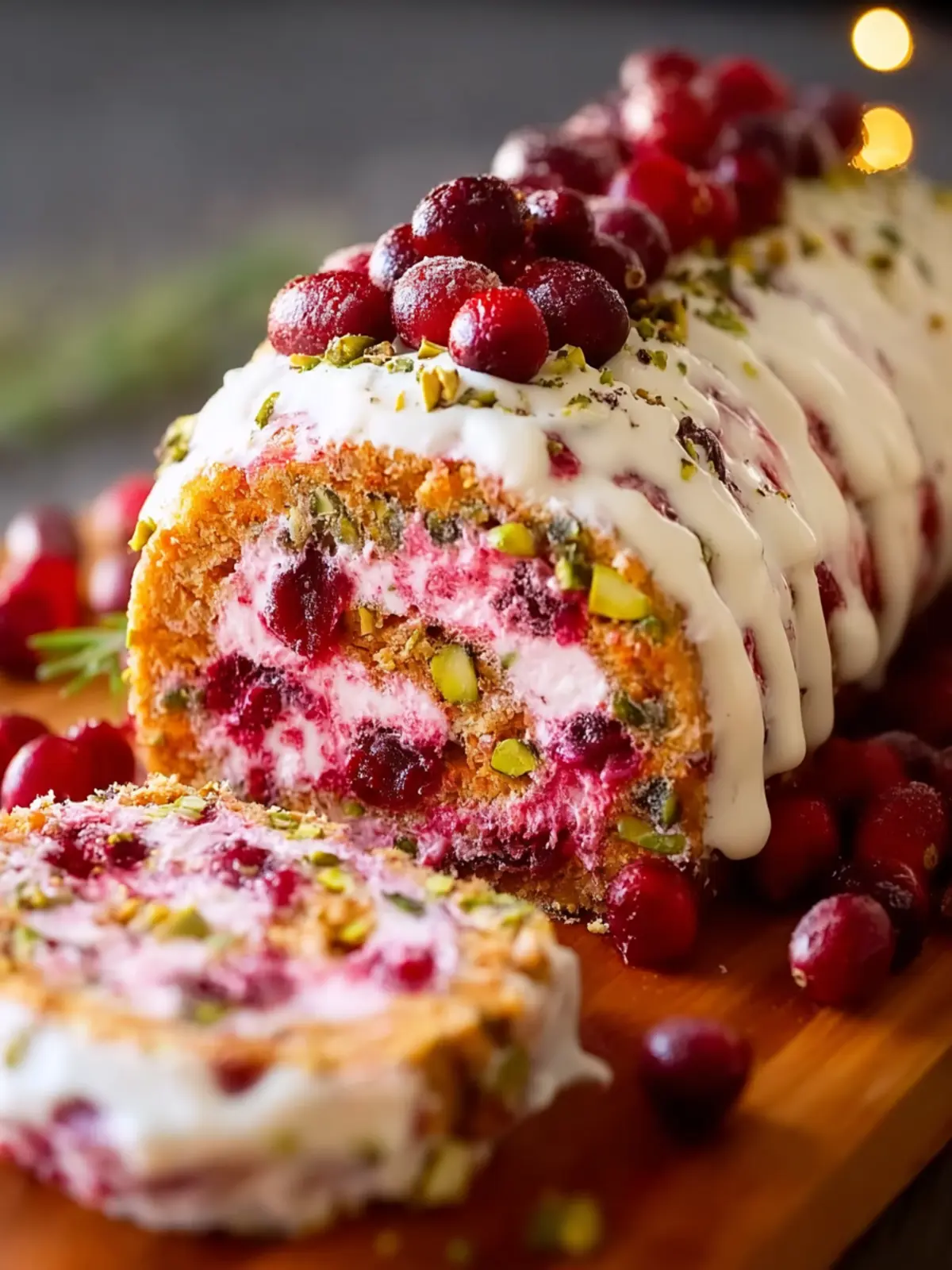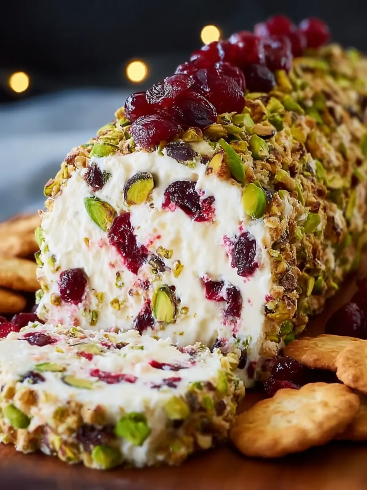 A delightful cream cheese log rolled in cranberries and pistachios, perfect for serving with crackers or sliced baguette.