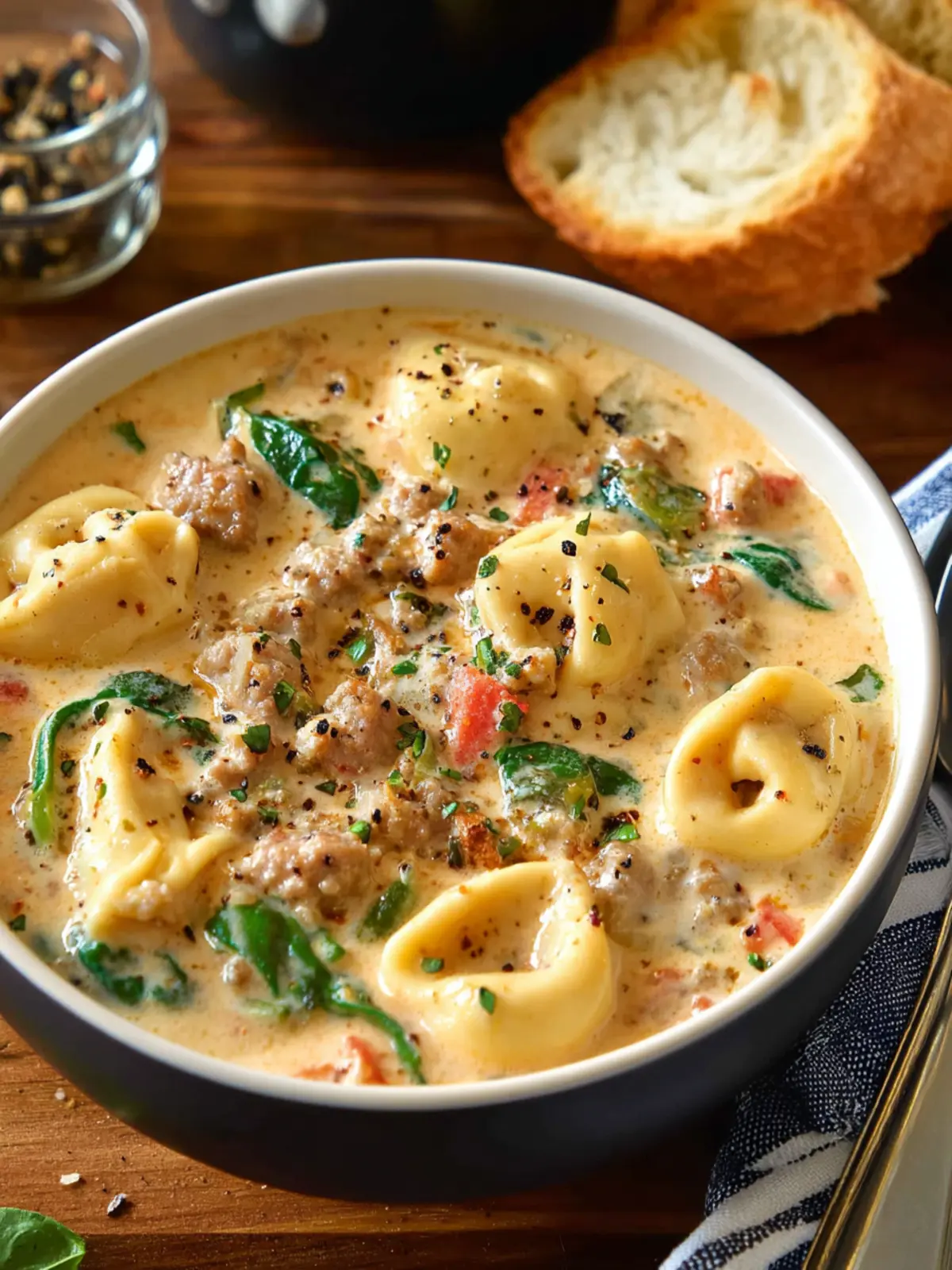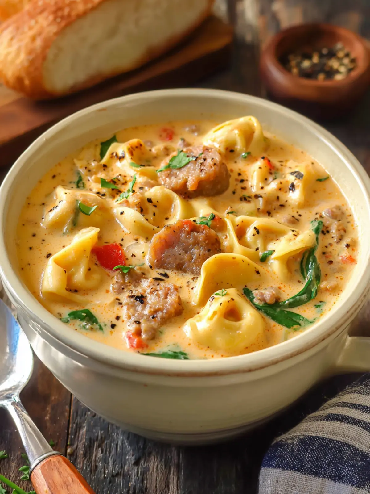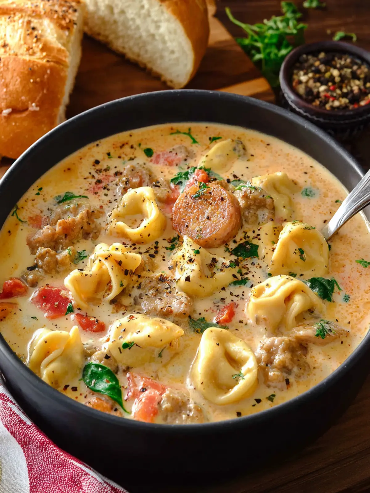 A delicious and hearty soup made with Italian sausage, tortellini, and spinach in a creamy broth.