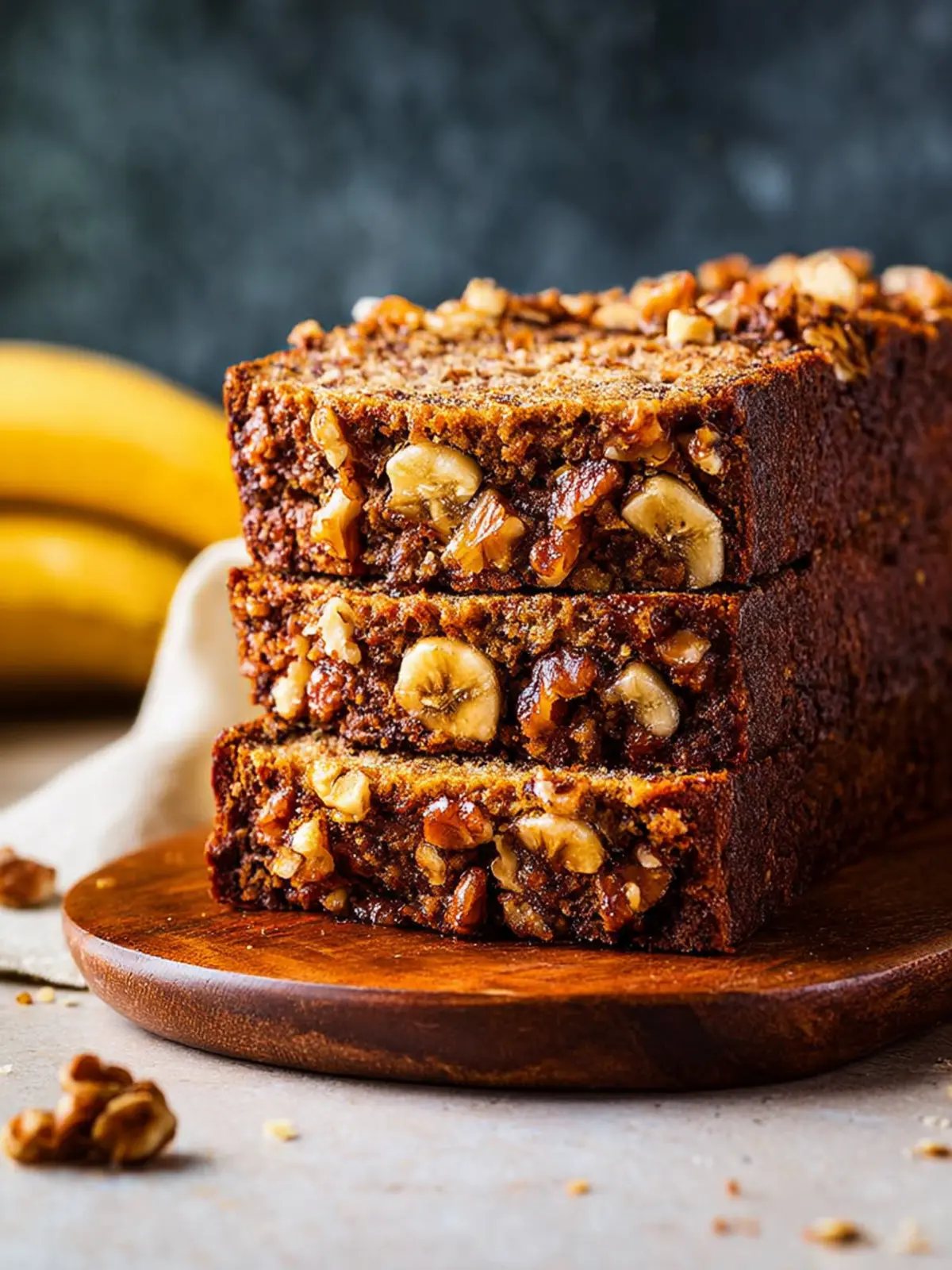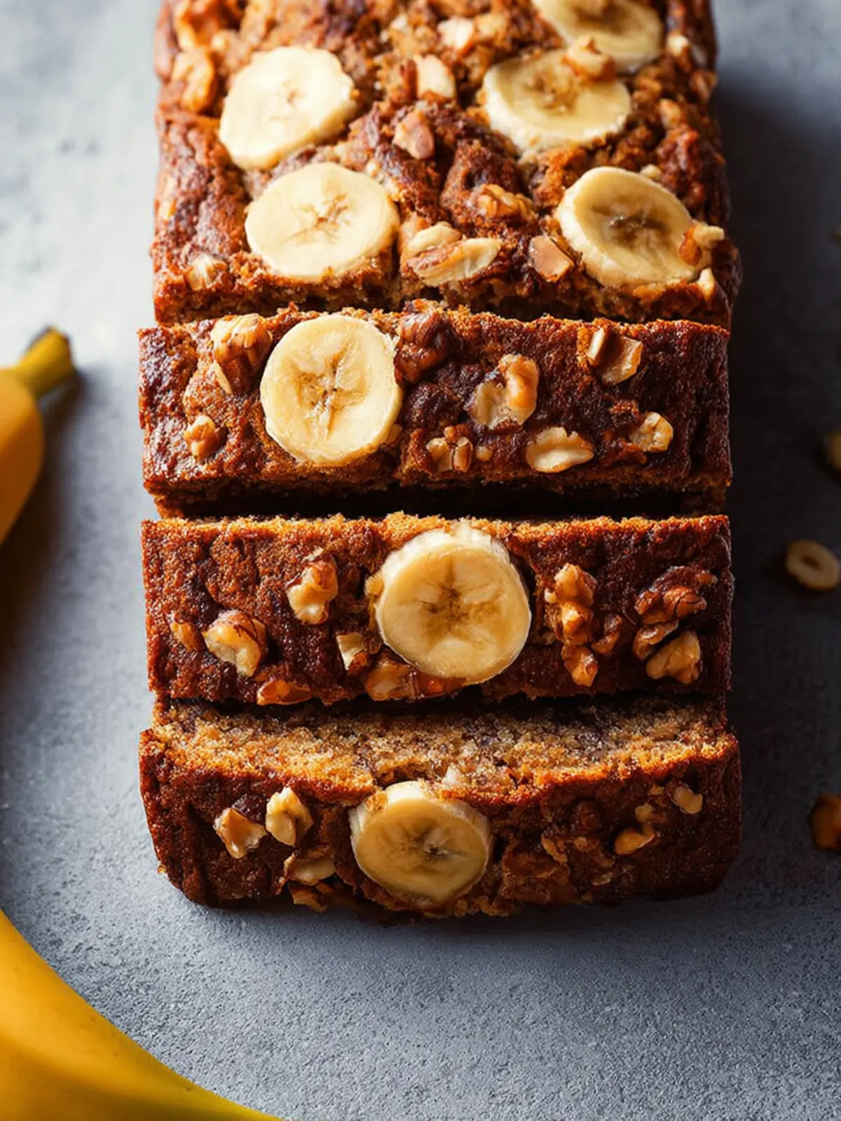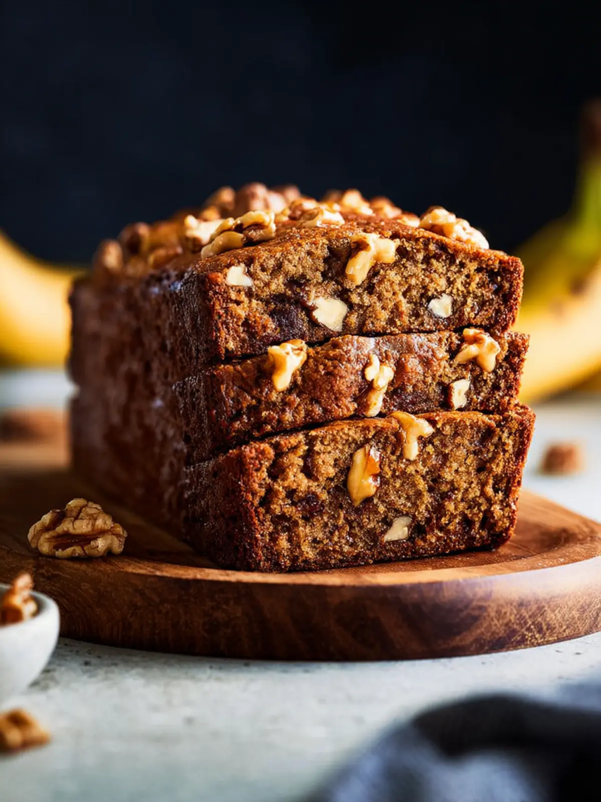 A delicious banana bread with walnuts that is perfect for snacking or breakfast.