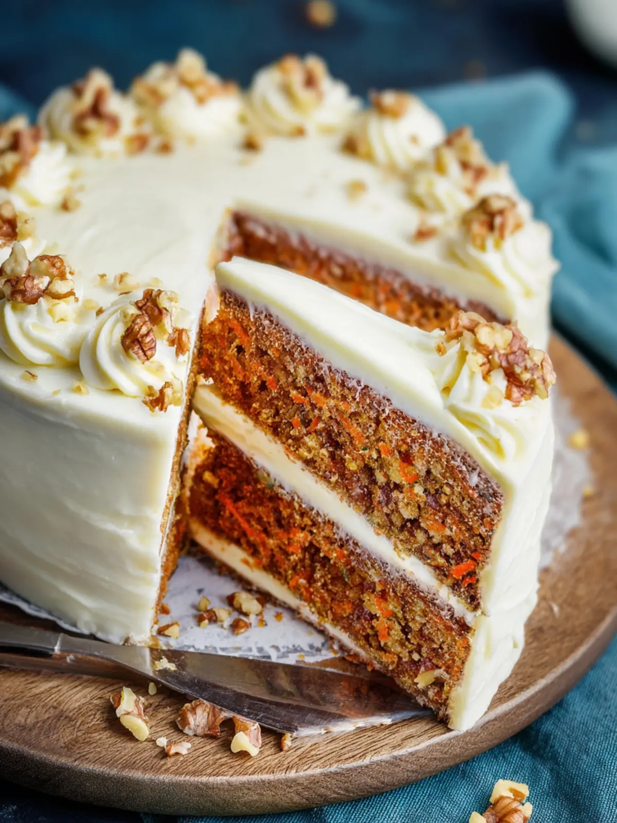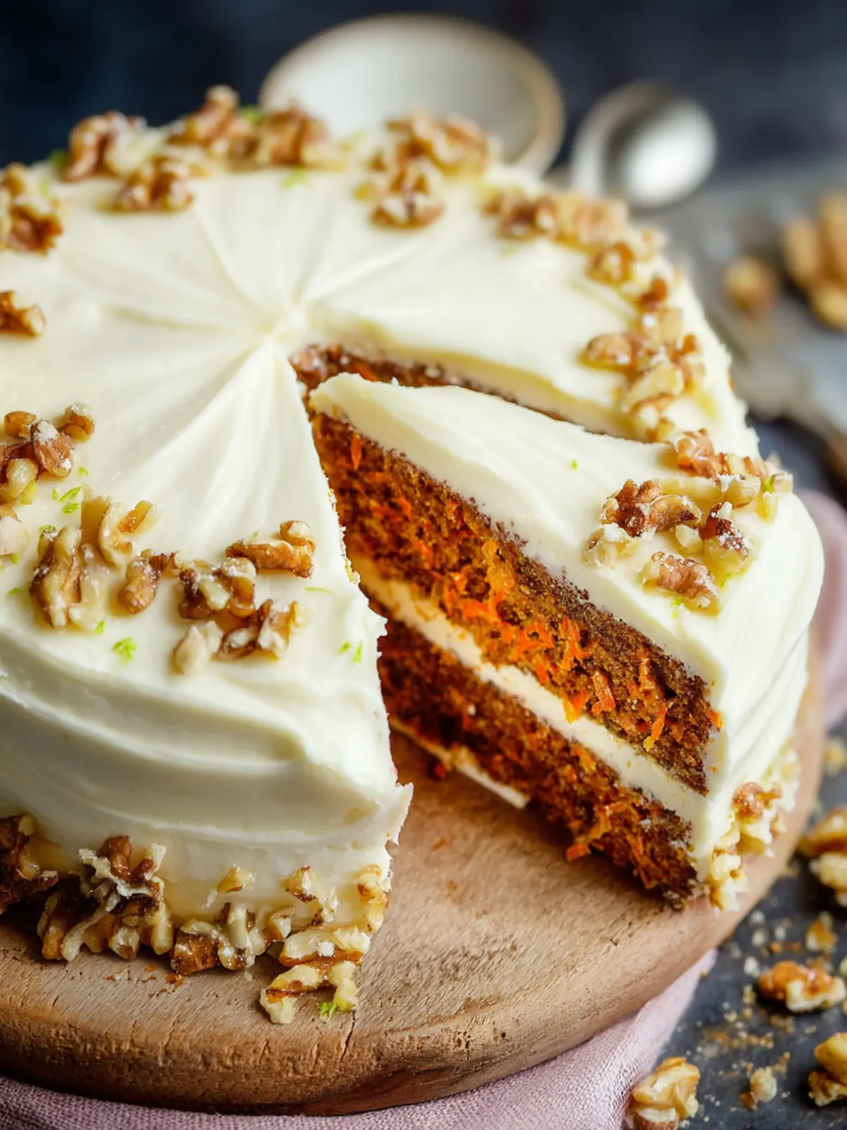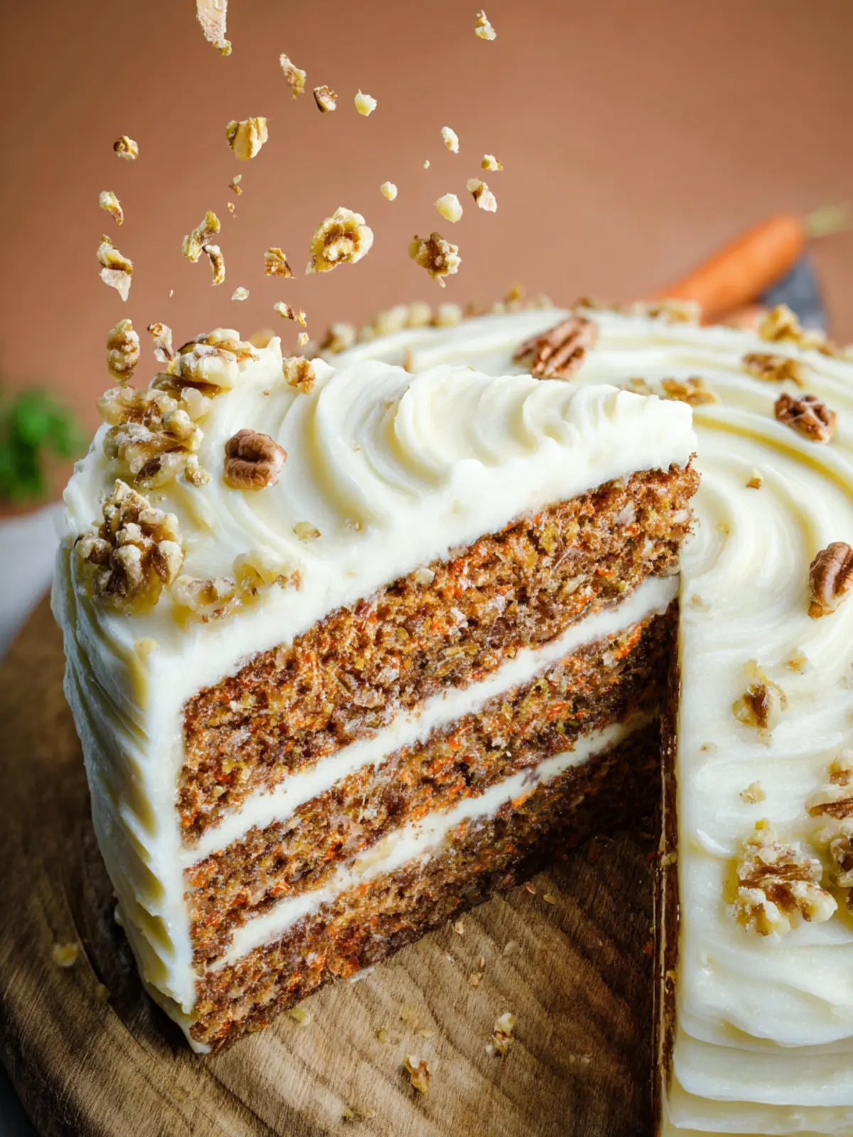A delicious and moist carrot cake topped with creamy frosting, perfect for any occasion.