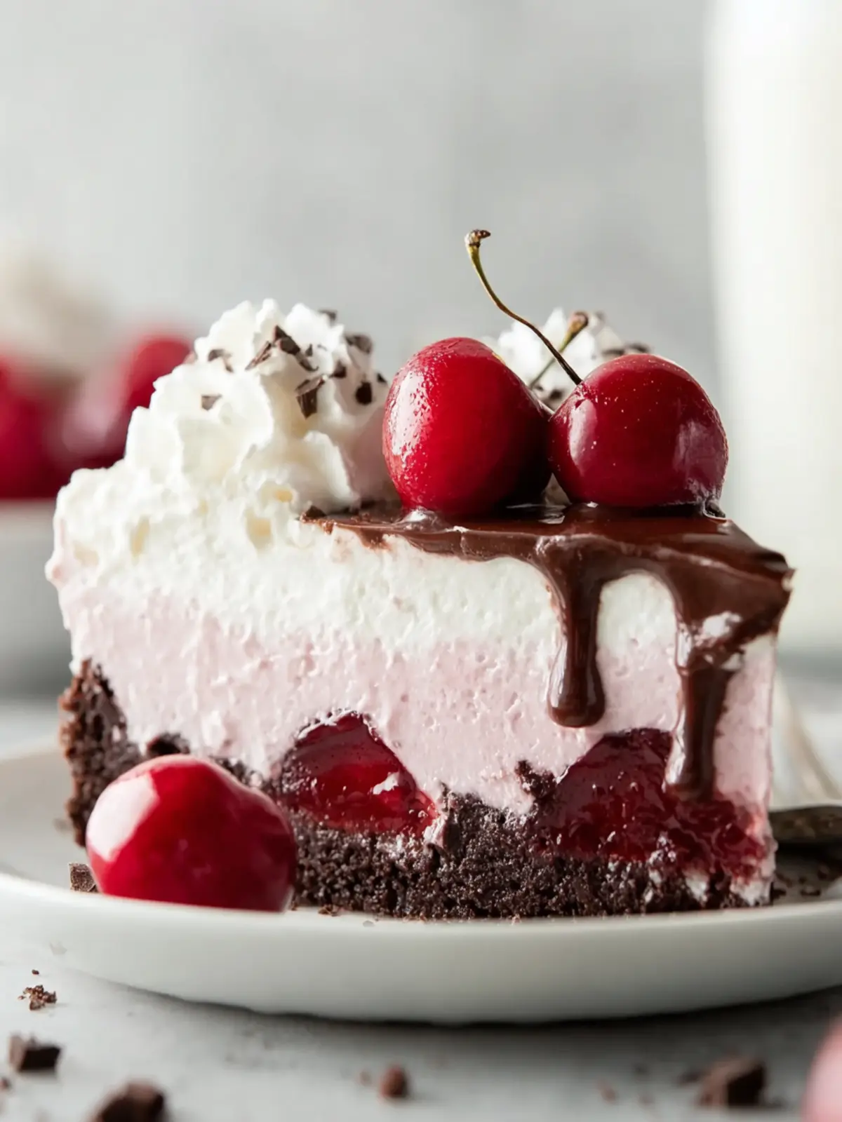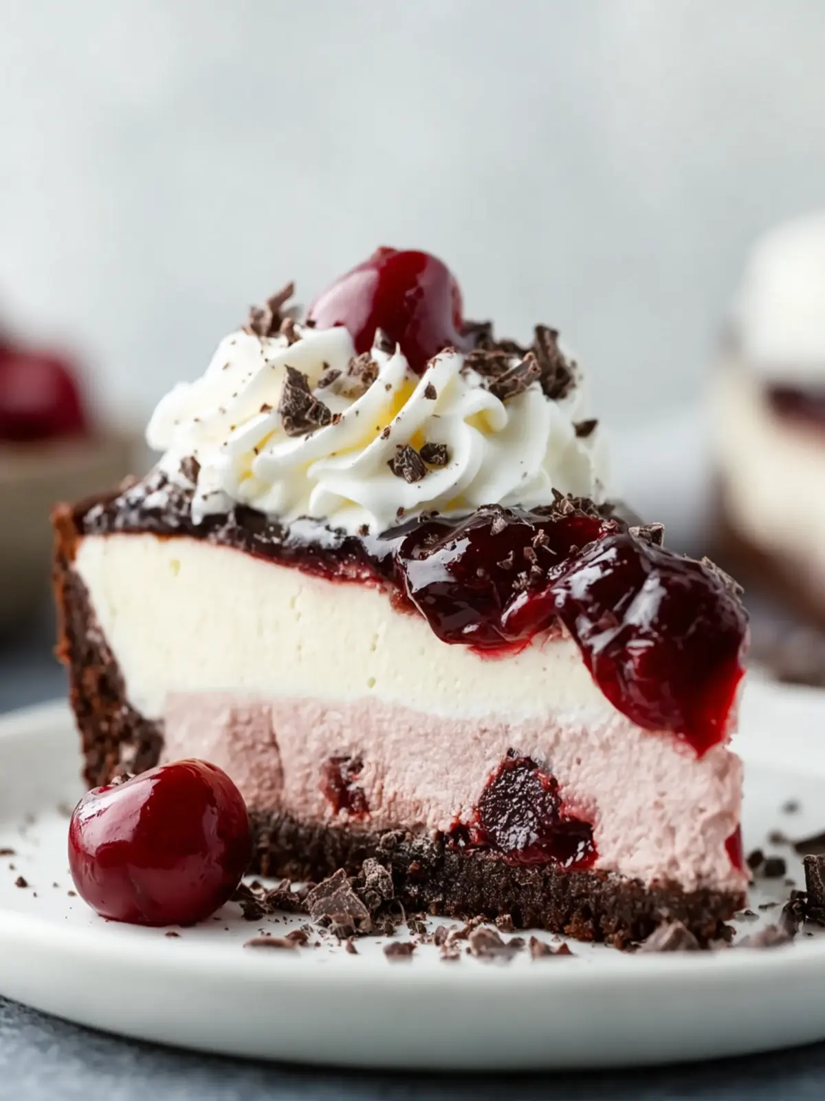 Get creative with your garnishes! A sprinkle of shaved chocolate or cocoa powder adds a touch of elegance. Pair it with fresh cherries or a drizzle of cherry sauce to enhance the rich chocolate and creamy layers.