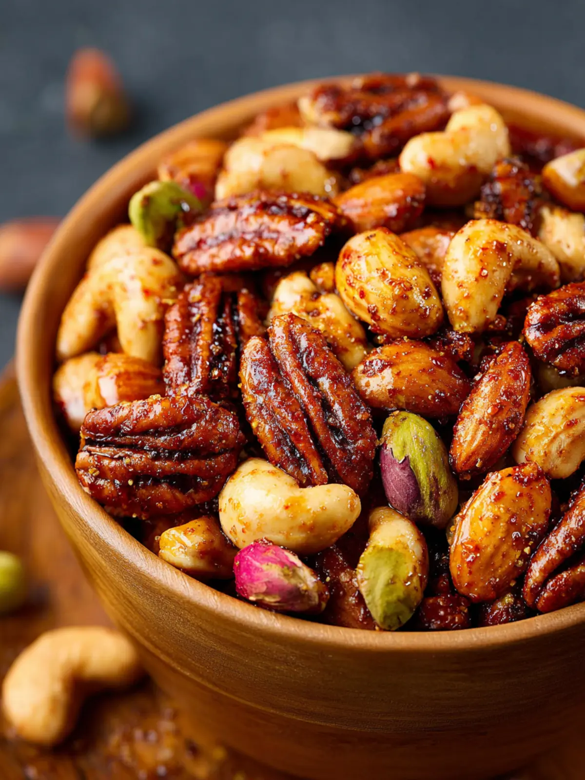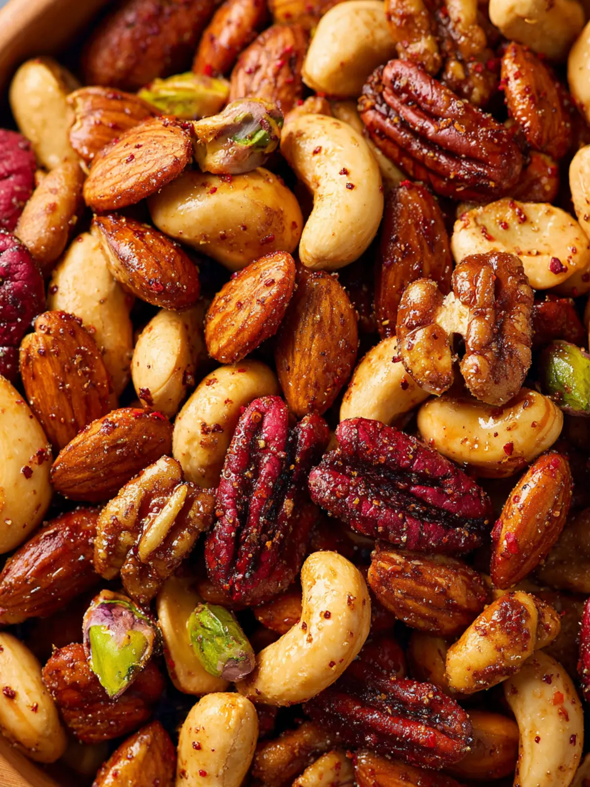 A delicious mix of roasted spiced nuts, perfect for snacking.