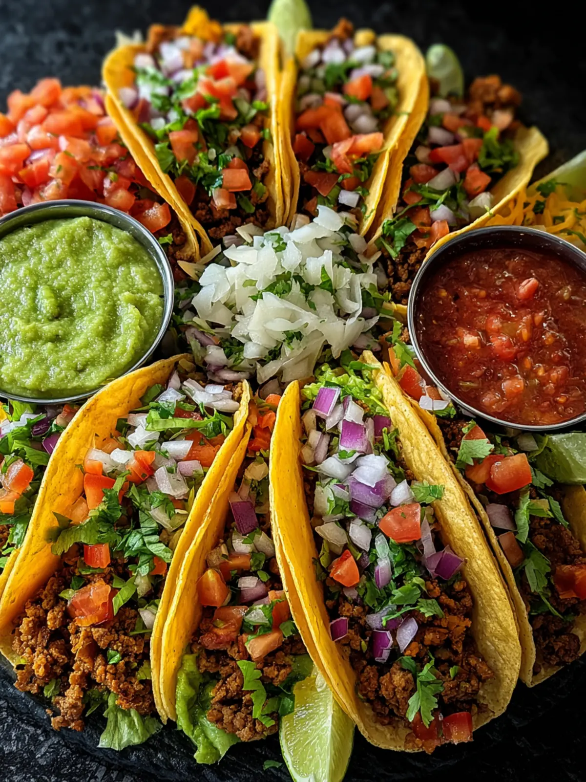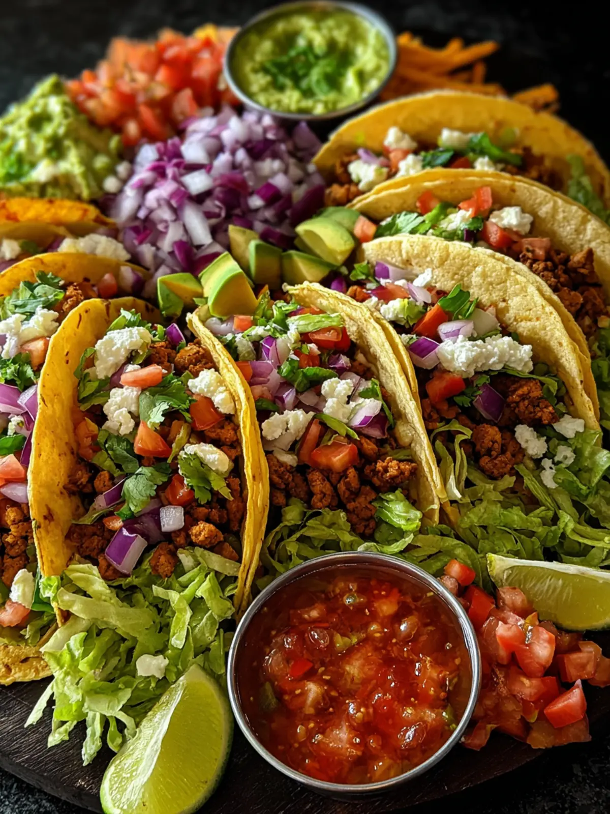 Delicious homemade tacos with ground beef, fresh toppings, and a variety of ingredients for a customizable meal.